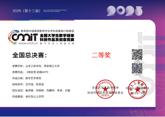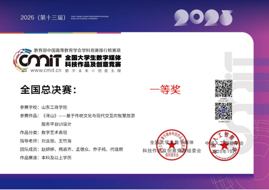 为激发教师育人活力、提升学科竞赛水平,学校启动学科竞赛“揭榜挂帅”活动,鼓励教师主动认领竞赛项目,以目标为导向深耕育人实践。王竹海老师凭借在数字媒体技术领域的专业能力与丰富竞赛指导经验,自项目启动以来,他始终以“以赛促教、以赛导学”为核心,全身心投入竞赛指导。从6月启动作品筹备,到10月全国总决赛落幕,他带领学生团队历经投稿筛选、省赛比拼、国赛冲刺等多个环节,在省赛阶段,团队已率先斩获18项省级奖项,为冲击国赛筑牢坚实基础。10月24日-26日,在哈尔滨工业大学举办的全国总决赛中,团队作品凭借鲜明的创新理念、过硬的实践能力脱颖而出:《寻山——基于传统文化与现代交互的智慧旅游服务平台UI设计》斩获一等奖,《静眠芽-助眠APP》《现代军事武器展厅的设计与制作》等4件作品荣获二等奖,获奖成果覆盖数字艺术表现、虚幻引擎创作等多个核心赛道,彰显了团队多元创新的实力。