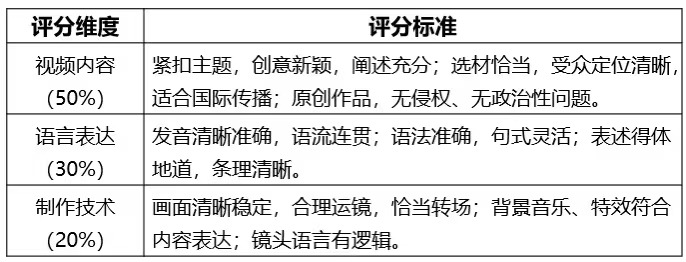 参赛选手围绕本年度比赛主题“美丽中国”制作原创短视频,视频时长3—5分钟,须配中英双语字幕。美丽中国,既有环境之美,也有时代之美、生活之美、社会之美、百姓之美。期待同学们的精彩阐释。