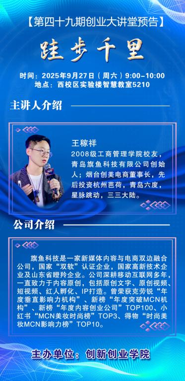 主讲人:王稼祥,2008级工商管理学院校友,青岛旗鱼科技有限公司创始人;烟台创美电商董事长,先后投资杭州芭荷,青岛六度,星脉跳动,三三大陆。