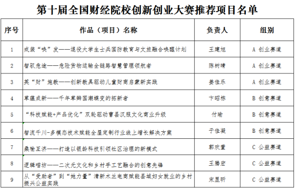 按照《关于举办“招商银行杯”第十届全国财经院校创新创业大赛校内选拔赛的通知》有关要求与推荐名额,学校于9月下旬至10月上旬通过资格审核、专家组评审,择优遴选9个项目推荐参加国赛阶段比赛。现将推荐项目名单予以公示。如有异议,请于公示期内到创新创业学院反映。
