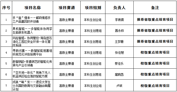 按照《关于推荐报送中国国际大学生创新大赛(2026)重点培育项目的通知》有关要求,经过团队申报、学院审核、校外专家盲评,确定3项为推荐省级重点培育项目,其余4项为校级重点培育项目。现将项目名单予以公示。如有异议,请于公示期内到创新创业学院反映。
